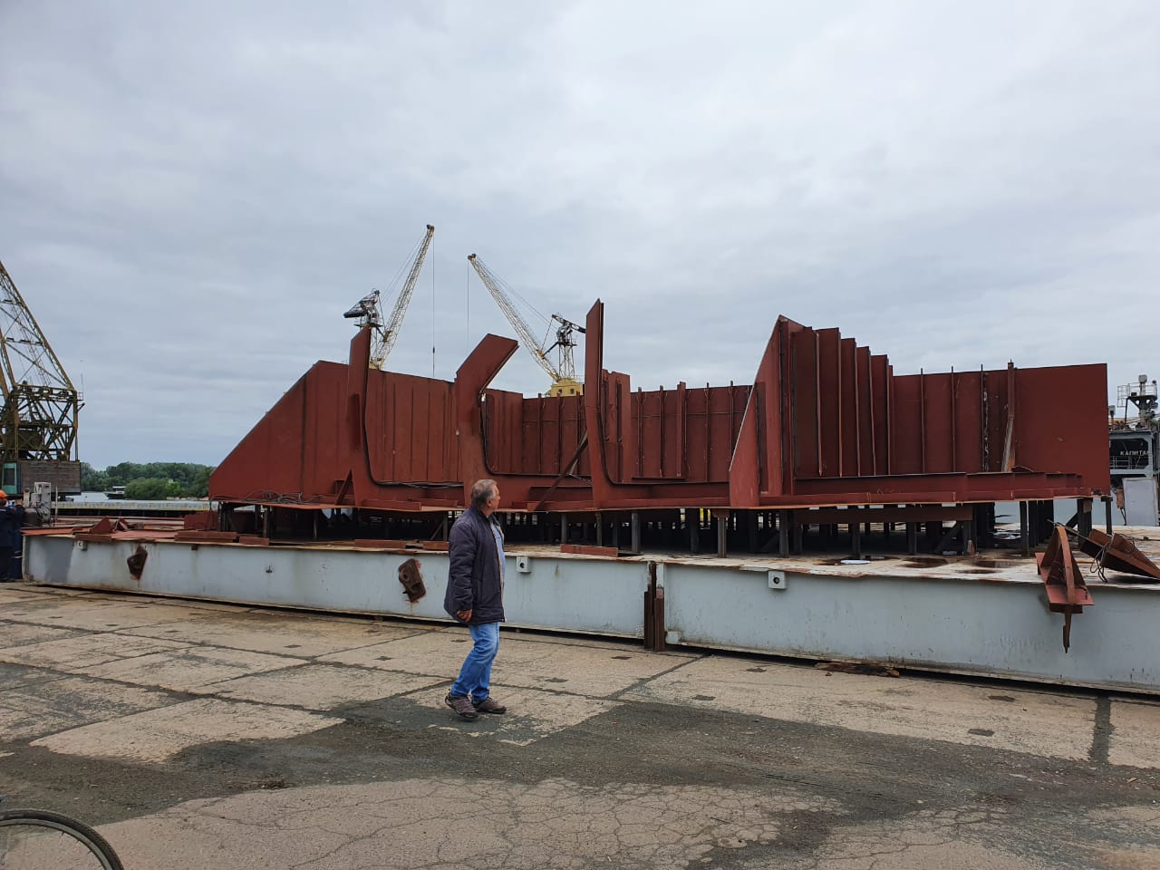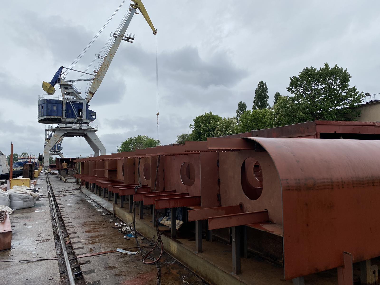 Наразі у цеху металообробки закінчені роботи, виконана порізка та гнуття металу для виготовлення деталей корпусу баржі. Збірний цех виконує збірку бортових секцій, а також завершує будівництво дніщевих секцій, частина з яких вже поставлені на “ДУНАЙСУДНОСЕРВІС” в док для стикування, а частина виставлені для стикування на елінг на “ДУНАЙСУДНОРЕМОНТ”.